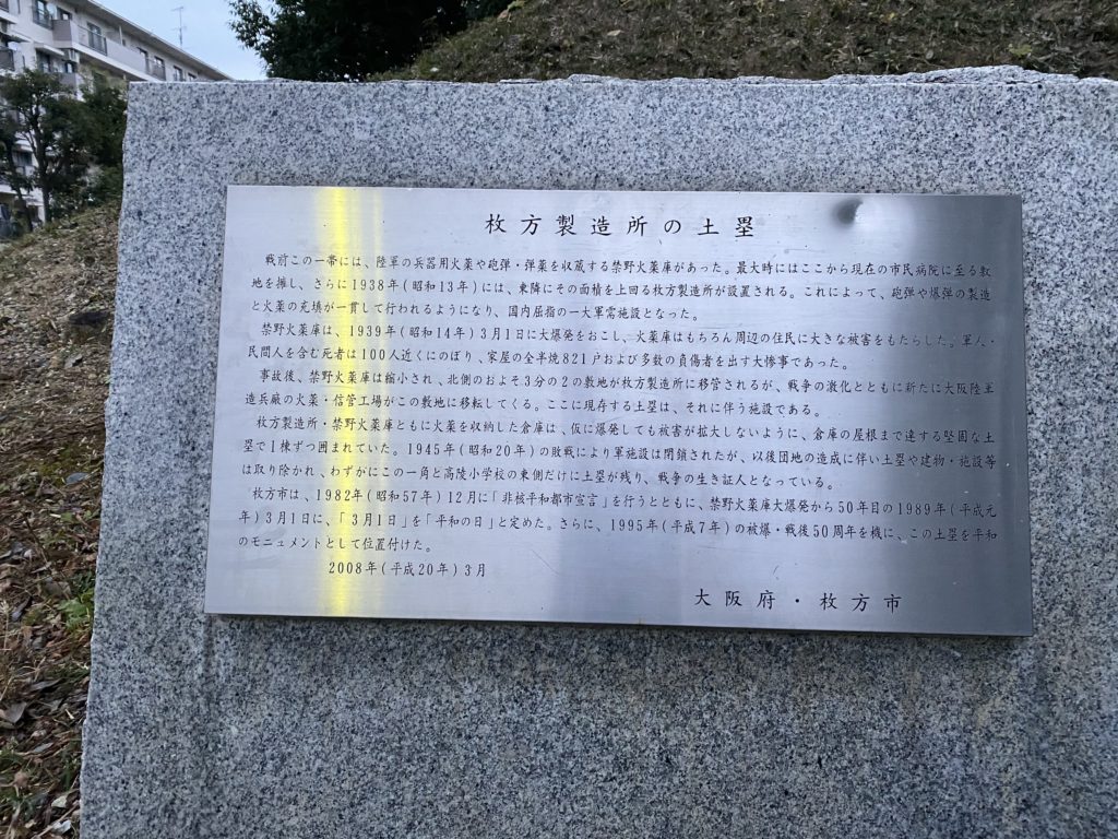 枚方市の平和マップに掲載されている「枚方製造所跡の土塁」。