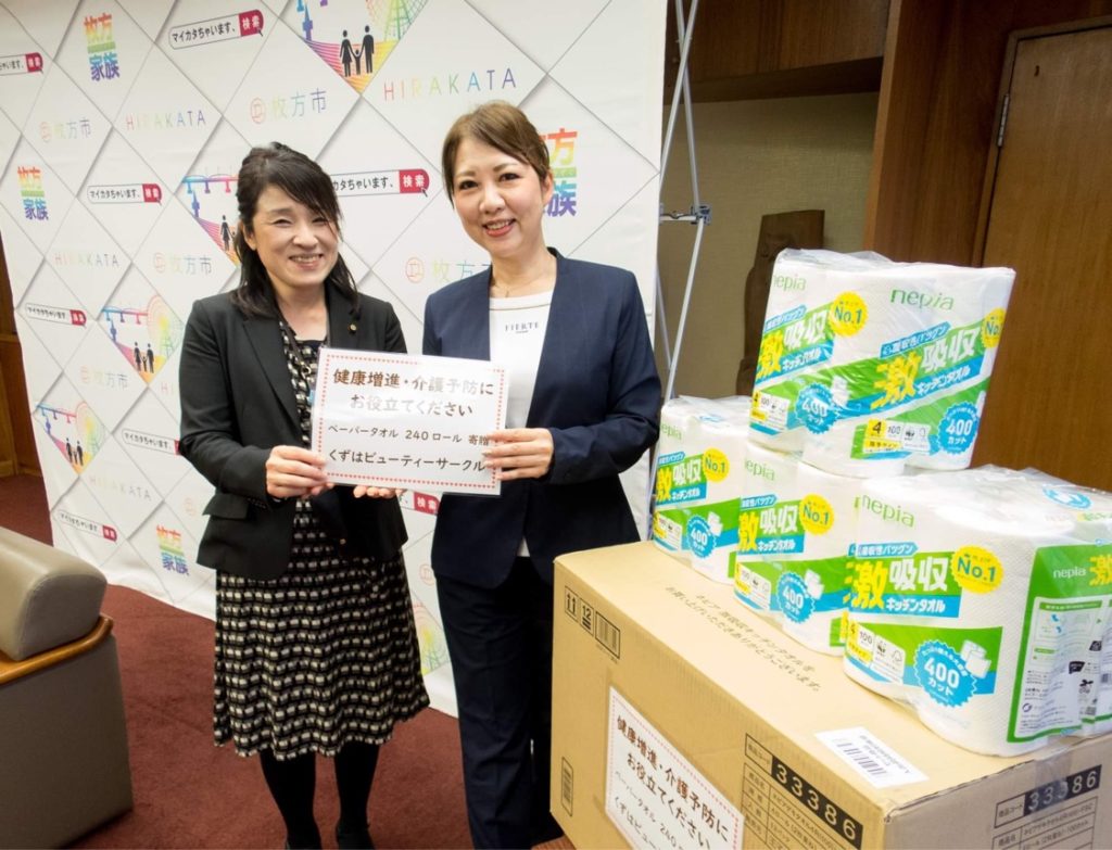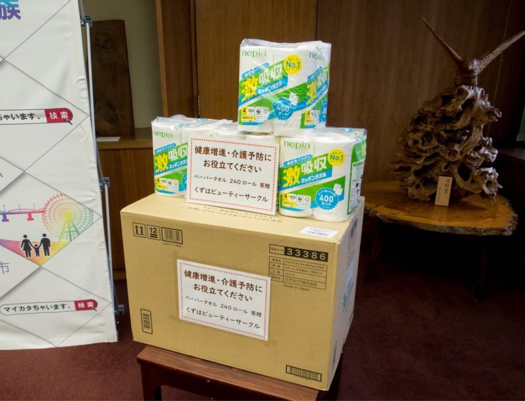 冷たい雨となりましたが、市役所にはくずはビューティサークルの皆様が市への寄付としてキッチンペーパーをたくさんご寄付頂きました。
