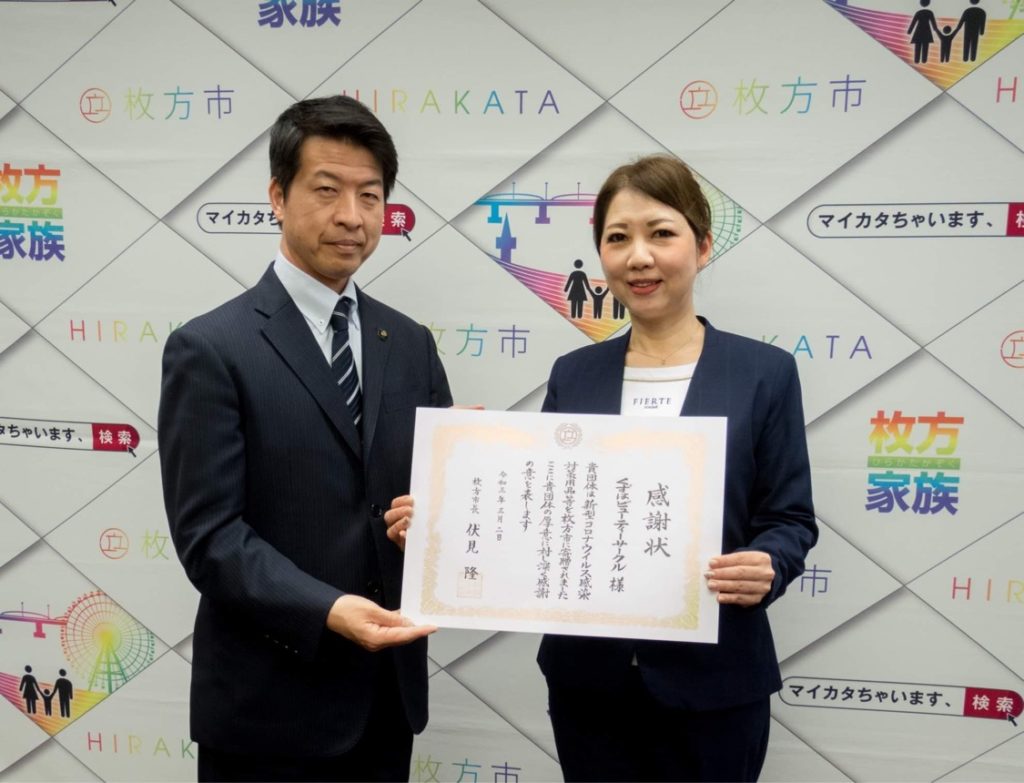 コロナ禍でイベントの中止となり、いつもイベントにがん検診等のブースでご協力いただいていた保健センターをはじめ消毒時などで利用頻度の高い物としてご寄付頂きました。