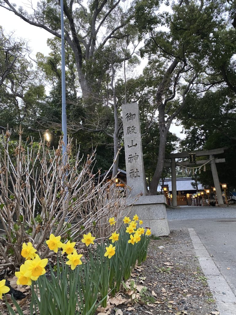 神社の鳥居の前には綺麗な水仙が咲いています^ – ^