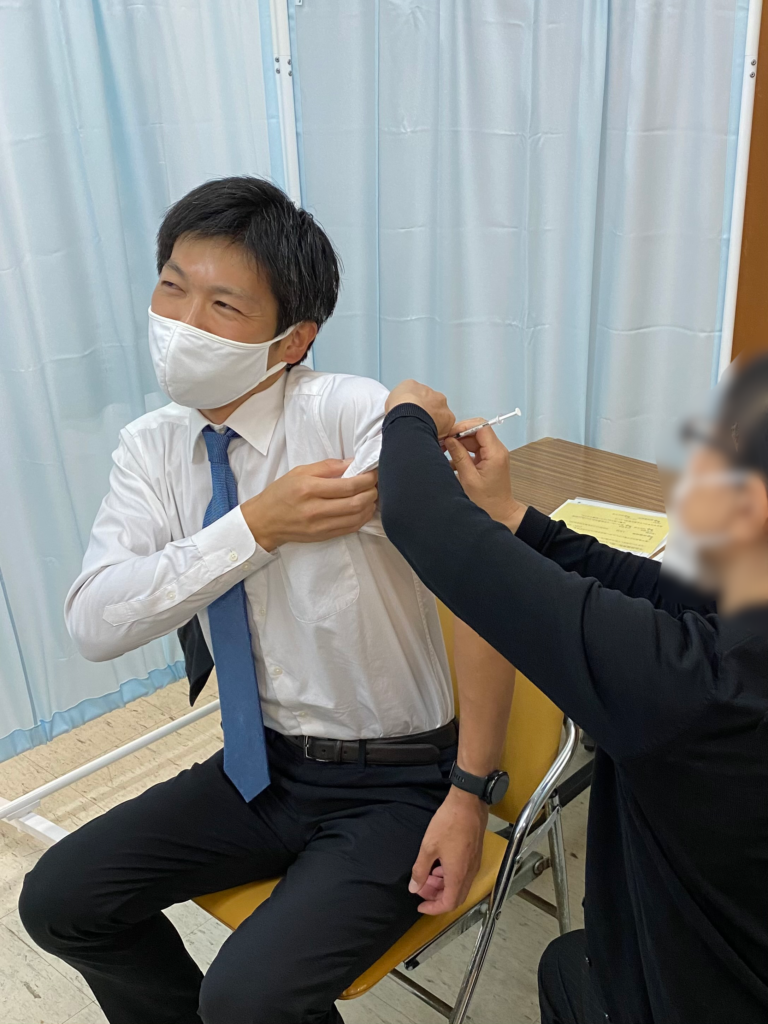 番匠議員が接種の模擬体験を行って頂きました。議員からは筋肉注射なので腕を出しやすい素材の洋服が良いですね。と仰っておられました。確かにそうですね。