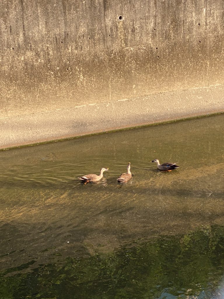 今朝は近所の河川でカモが朝ごはん。