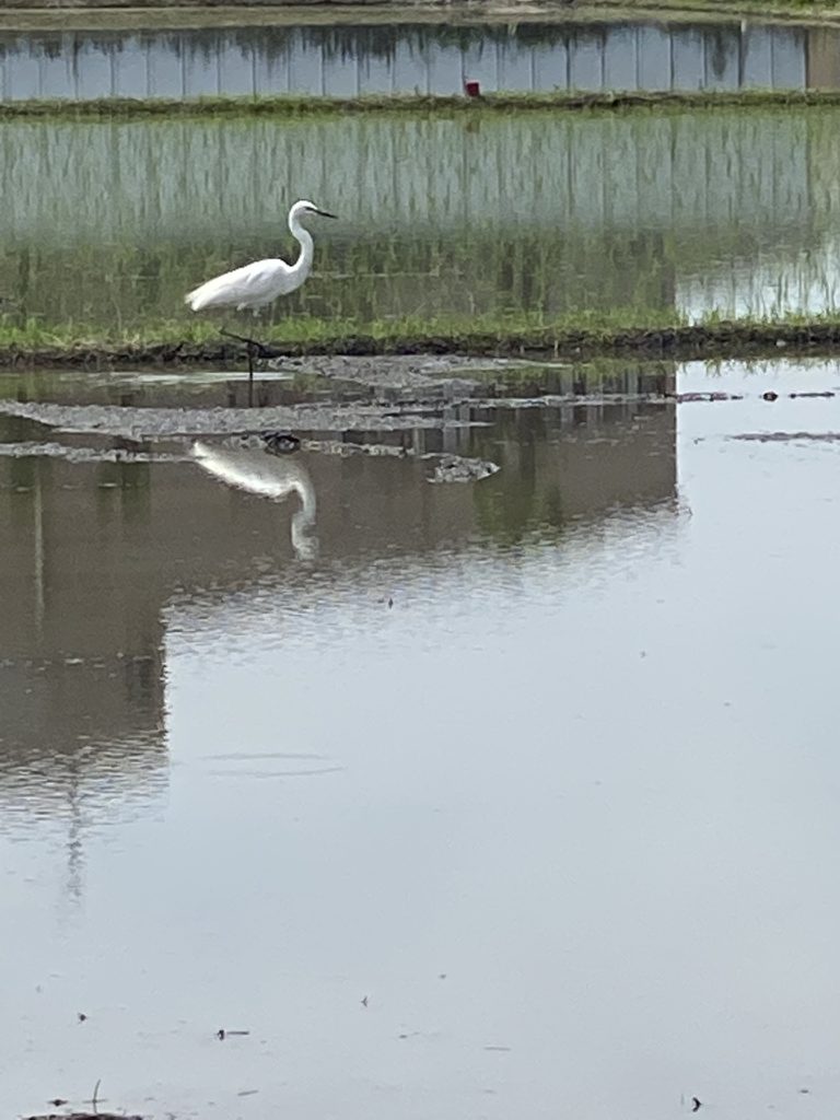 田植え前の田んぼの中を鷺が歩いていました。