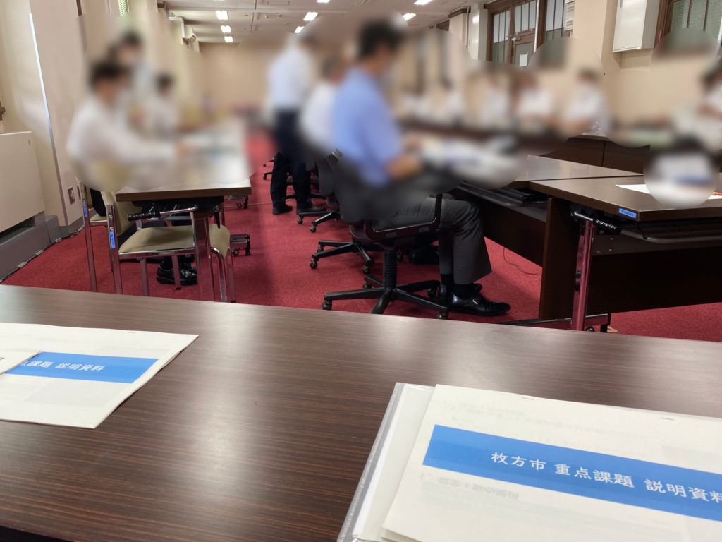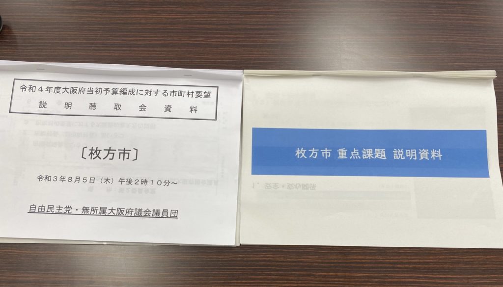 自由民主党・無所属大阪府議会議員団の須田 旭府議、塩川 憲史府議が進行して頂き、市長はじめ理事者の皆さんの参加のもと、市の要望に対する府の考え方について説明を受けました。