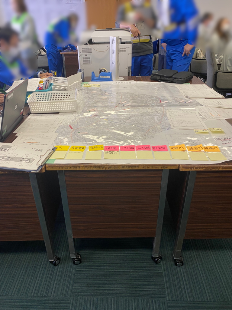 コロナ禍の中、水害・土砂災害を想定した訓練で災害対策本部の設置から本部事務局、各部災害対策本部、枚方・交野警察署、枚方寝屋川消防組合本部、枚方消防団、陸上自衛隊、そしてドローンによる情報収集に係る協議として本市と災害協定を締結している企業さん等が参加して頂きました。