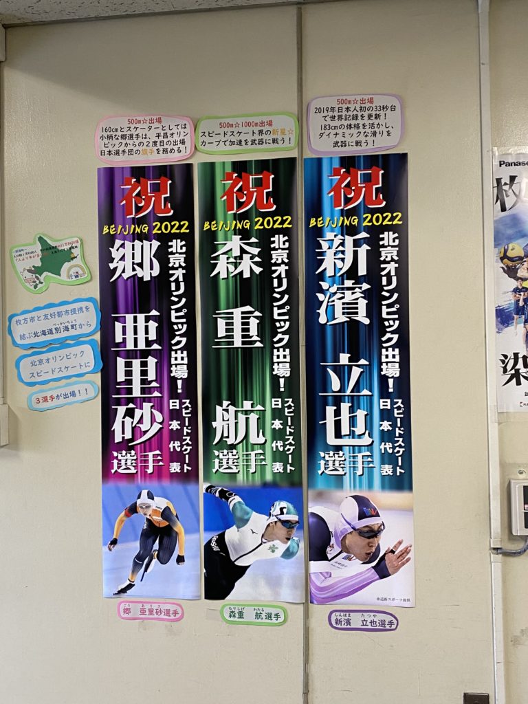 別海町の職員の方へお祝いメールをさせていただいたところ、別海町からは同じくスピードスケートで新濱 立也選手、森重 航選手が出場されるという事で、早速枚方市でも応援のお願いをさせていただいたところ、市役所別館入口にポスター掲示をしていただきました。