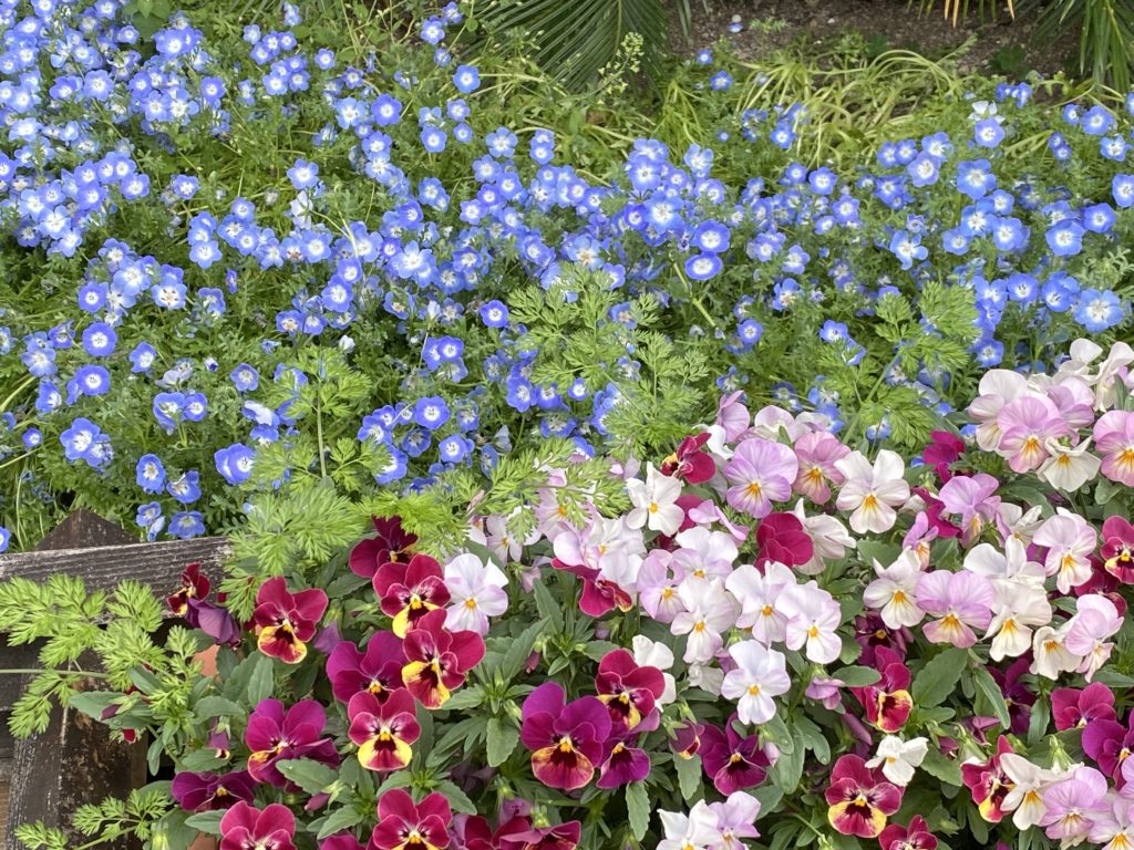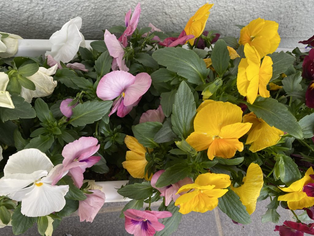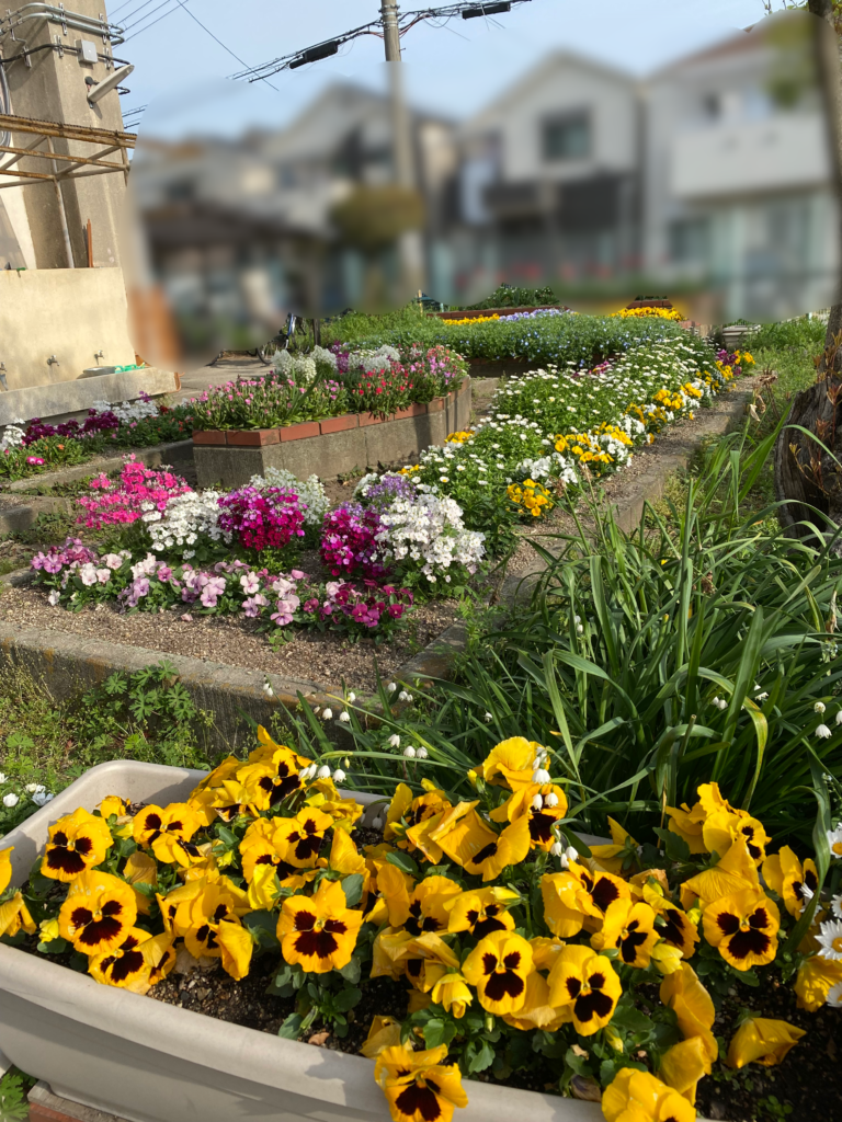 殿山第一小学校の校門を入るとたくさんのお花が児童たちを出迎えています。