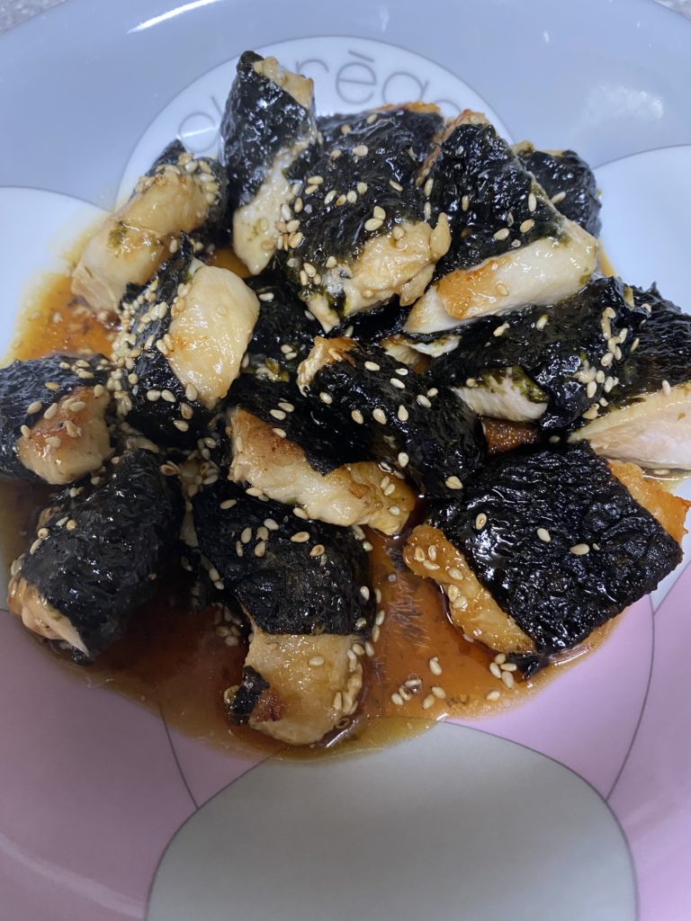 今夜は鶏胸肉を海苔で巻き甘辛く焼きました。