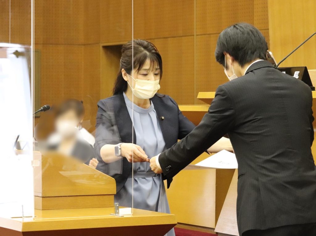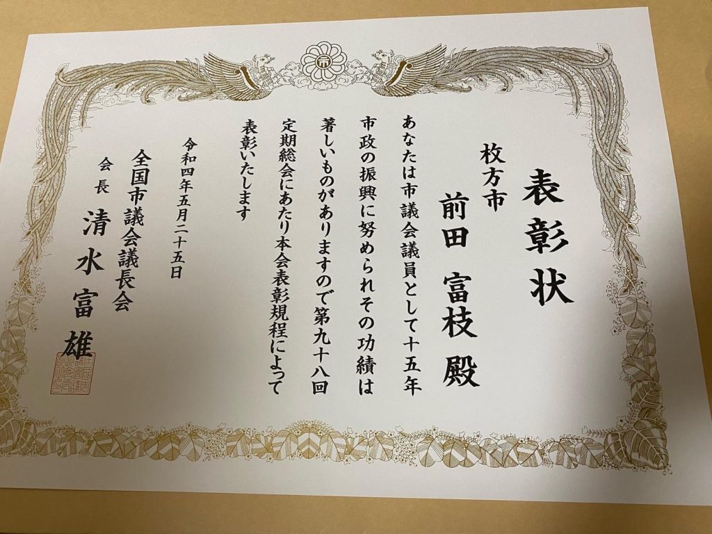 本会議を休憩し、15年の永年勤続議員表彰を全国市議会議長会から頂きました。