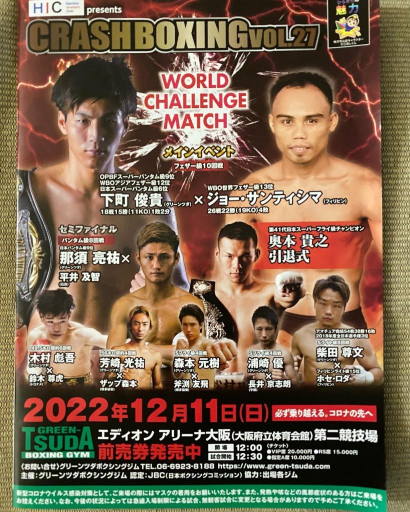 グリーンツダボクシングジムの下町 俊貴選手がWBO世界フェザー級13位のジョー・サンティシマ選手に判定勝ち。