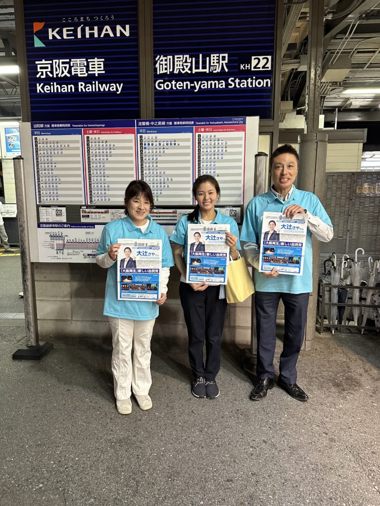夕方には自由民主党大阪第11選挙区支部(交野市、枚方市)支部長に新たに就任された大辻さやさんと長友議員と共に御殿山駅にて活動を行いました。