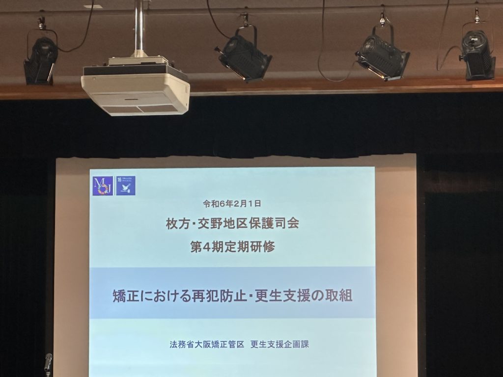 定期研修として法務省大阪矯正管区更生支援企画課の職員の方を講師としてお招きし、「矯正における再犯防止・更生支援の取組」についてお話をお聞きしました。