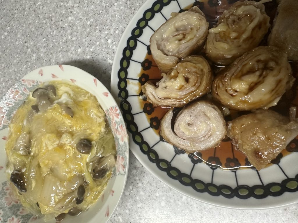 今夜は豚バラの中にチーズを入れて焼いたものと白菜としめじの卵とじです。