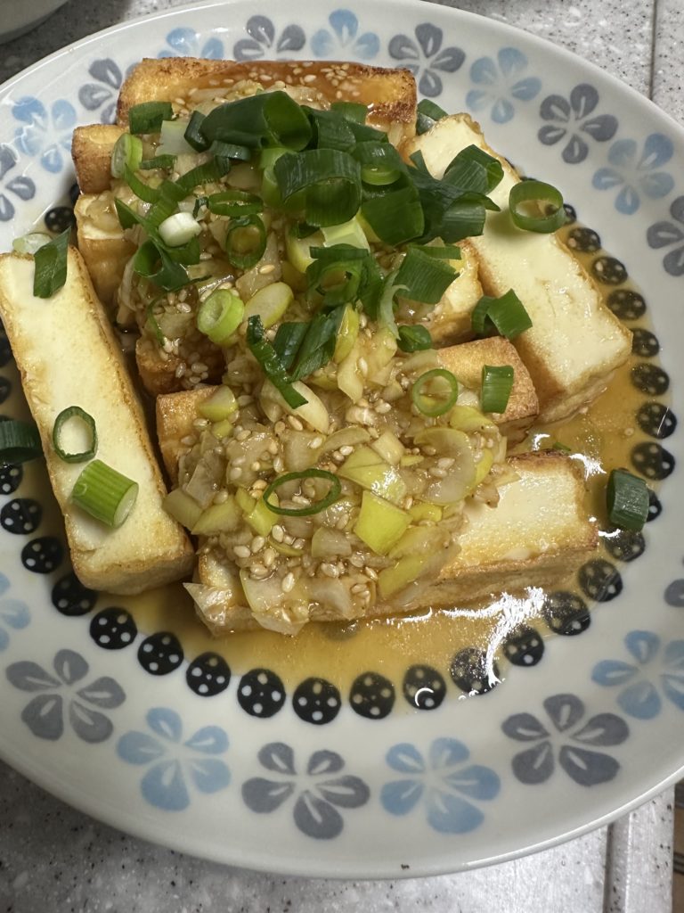 今夜は焼き厚揚げのネギだれです。