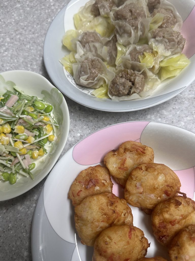 そして今夜は焼売、はんぺん揚げ、水菜サラダです。