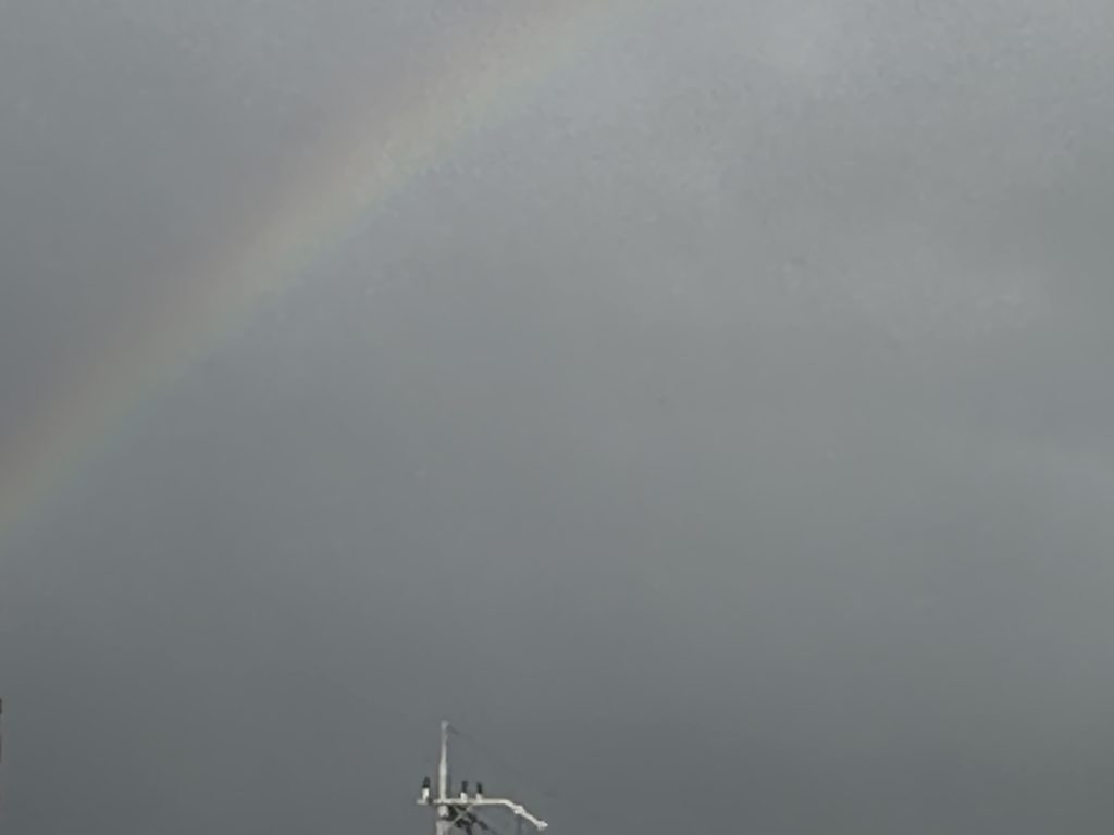 夕方、空を見上げると暗い雲の中から虹が見えました。