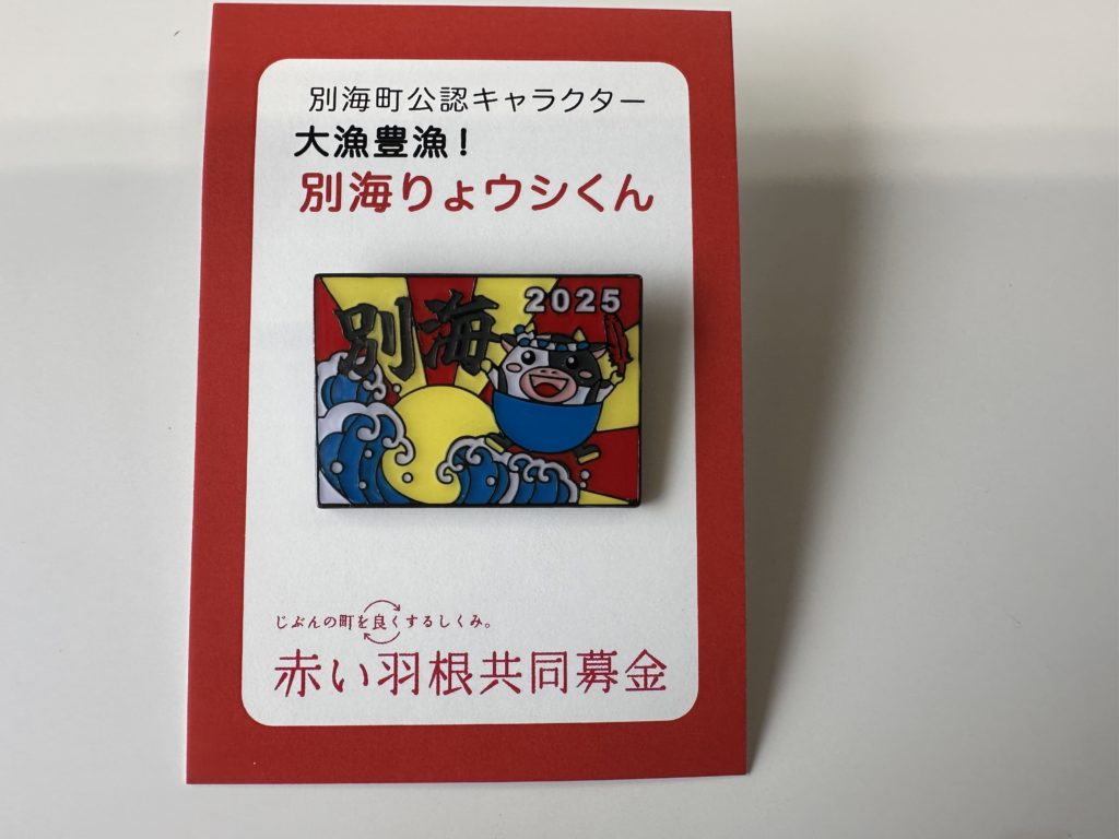 知人の方から別海町の公式キャラクターのりょウシくんのピンバッジをいただきました。