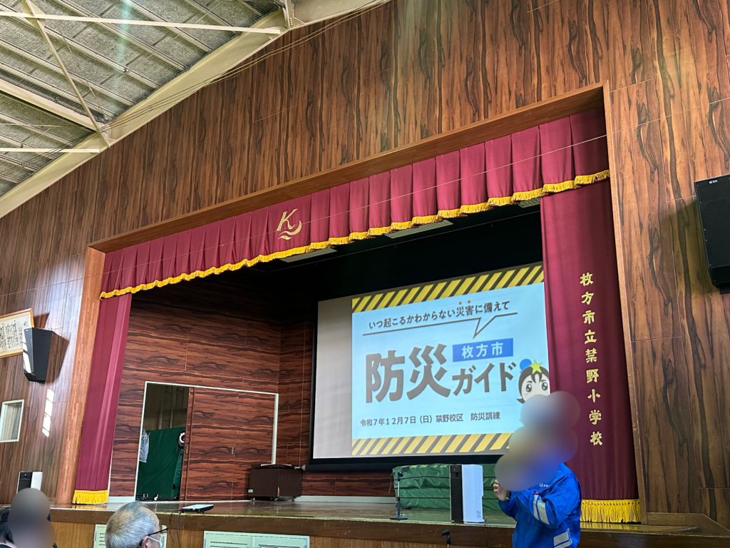 今日は禁野校区コミュニティ主催の防災訓練へ。